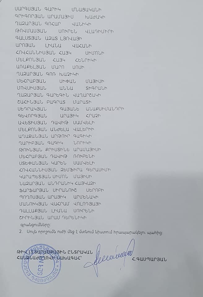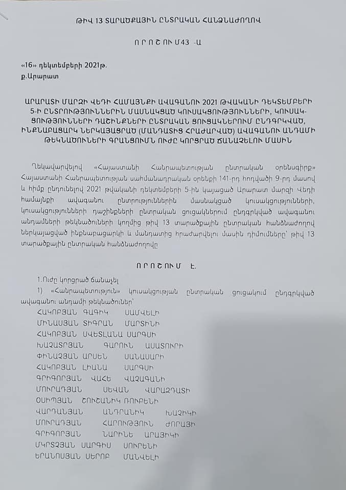 Թիվ 13 տարածքային ընտրական հանձնաժողովն ուժը կորցրած է ճանաչել Վեդի համայնքում կայացած ՏԻՄ ընտրությունների արդյունքներով ավագանիում մանդատներ ստացած «Քաղաքացիական պայմանագիր» և «Հանրապետություն» կուսակցությունների ցուցակների բոլոր թեկնածուների գրանցումը, այս մասին հայտնել է Վեդիի ընտրություններում «Քաղաքացիական պայմանագիր» կուսակցության համայնքապետի թեկնածու Գարիկ Սարգսյանը:
