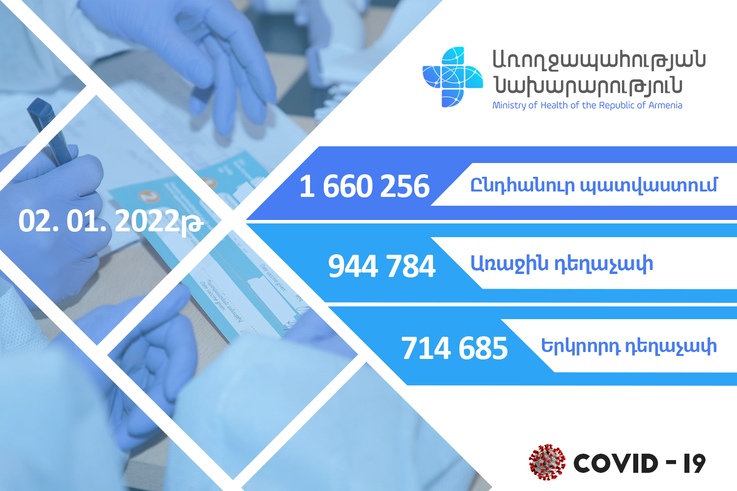 Հայաստանի Հանրապետությունում հունվարի 2-ի դրությամբ կատարվել է 1 660 256 պատվաստում, այս մասին տեղեկացնում է Առողջապահության նախարարությունը։