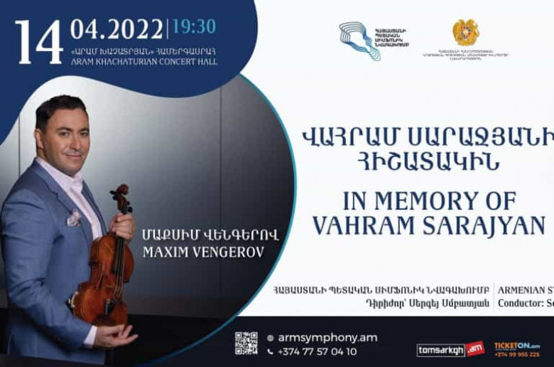 ՄՇԱԿՈՒՅԹԱպրիլի 14-ին՝ ժամը 19։30-ին, Արամ Խաչատրյան համերգասրահում տեղի կունենա անվանի թավջութակահար Վահրամ Սարաջյանի հիշատակին նվիրված համերգային երեկո, որի ընթացքում հանդես կգա համաշխարհային հեղինակություն վայելող վիրտուոզ ջութակահար, Գրեմմիի դափնեկիր Մաքսիմ Վենգերովը: Դիրիժոր Սերգեյ Սմբատյանի ղեկավարությամբ Հայաստանի պետական սիմֆոնիկ նվագախումբը և Մաքսիմ Վենգերովը կկատարեն Ֆելիքս Մենդելսոնի Ջութակի կոնցերտը։ Համերգային ծրագրում կհնչեն նաև Կլոդ Դեբյուսիի «Ֆավնի հետկեսօրյա հանգիստը», պրելյուդ, Մորիս Ռավելի «Պավանա Ինֆանտայի մահվան կապակցությամբ» ստեղծագործությունը, Ջակոմո Պուչինիի Սիմֆոնիկ պրելյուդը։