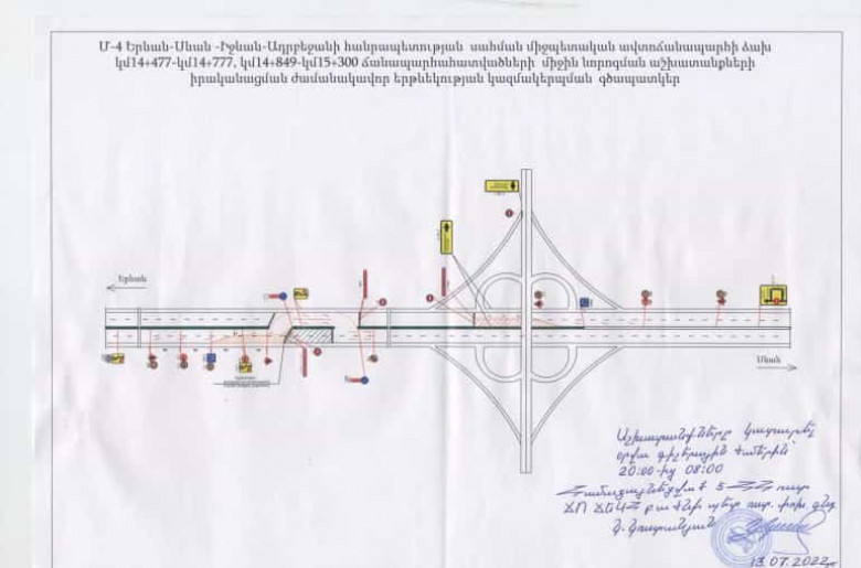 ՀԱՍԱՐԱԿՈՒԹՅՈՒՆՄ-4, Երևան-Սևան-Իջևան-Ադրբեջանի սահման միջպետական նշանակության ավտոճանապարհի կմ14+477-կմ14+777 և կմ14+849-կմ15+300 հատվածների ձախ կողմում միջին նորոգման աշխատանքներ իրականացնելու նպատակով սույն թվականի հուլիսի 13-ից մինչև հուլիսի 16-ը ներառյալ` ժամը 20։00-ից 08։00, դադարեցվելու է երթևեկությունը կմ16+000 տեղամասից՝ Սևանից դեպի Երևան ուղղությամբ։