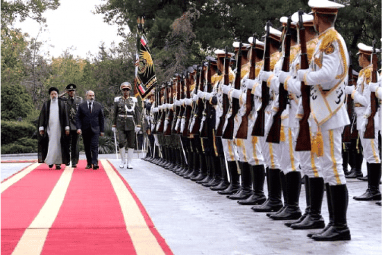 Հաջորդ օրը Փաշինյանը Իրանի նախագահ Էբրահիմ Ռաիսիի հրավերով աշխատանքային այցով մեկնել է Թեհրան։ Թեև այցի կարգավիճակը եղել է միայն աշխատանքային, սակայն հյուրին դե ֆակտո ընդունել են պաշտոնական այցի ընթացակարգով։ Հայաստանի և Իրանի շահերը տարածաշրջանում համընկնում են, իսկ առանցքային կետը այսպես կոչված «Զանգեզուրի միջանցք»–ն է: Բաքուն և Անկարան պնդում են, որ Ադրբեջանի արևմտյան շրջանները և Նախիջևանի ինքնավարությունը կապող հաղորդակցությունները պետք է ունենան նույն արտատարածքային կարգավիճակը, ինչը ունի Հայաստանը Լեռնային Ղարաբաղի հետ կապող տրանսպորտային միջանցքը։ Երևանը գտնում է, որ համապատասխան «երթուղիները» պետք է լինեն Հայաստանի իրավասության ներքո, եւ երկու ուղղություններով տեղափոխվող բեռներն ու ուղևորները պետք է անցնեն մաքսային և սահմանային ընթացակարգեր համաձայն Հայաստանի օրենքների։ Թեհրանը պաշտպանում է Հայաստանի դիրքորոշումը, և դեմ է տարածաշրջանում պետական սահմանների փոփոխությանը, այդ թվում Հայաստանի հետ իր ցամաքային կապի պահպանմանը։ Իրանցիները վախենում են Թուրքիայի և Ադրբեջանի միջև արտատարածքային ուղիղ ցամաքային կապի հաստատումից, որը կարող է հանգեցնել տարածաշրջանում ուժերի անհավասարակշռության, Թուրքիայի ազդեցության ուժեղացման և Իսրայելի՝ Բաքվի դաշնակիցի, կարողությունների ընդլայնմանը, ինչը էական վտանգ կստեղծի երկրի հյուսիսային տարածքների համար, որոնք բնութագրվում են թյուրքալեզու բնակչության կոմպակտ բնակությամբ։ Իրանի կառավարությունը բազմիցս է զգուշացրել Բաքվին, որ տարածաշրջանում սահմանների ուժային փոփոխությունն իր համար «կարմիր գիծ» է։ Նշանակված «կարմիր գծերը» պաշտպանելու պատրաստակամություն դրսևորելու համար Իրանը հոկտեմբերի 17-ից 19-ը Արևելյան Ադրբեջան և Արդաբիլ (երկրի հյուսիս-արևմուտք) նահանգներում անցկացրել է Իսլամական հեղափոխության պահապանների կորպուսի (ԻՀՊԿ) «Հզոր Իրան» պայմանական անվանմամբ ցամաքային զորավարժություններ: Զորավարժությունների ընթացքում մշակվել են իրադարձությունների զարգացման տարբեր սցենարներ, այդ թվում լայնամասշտաբ զինված բախում։ Հատկանշական է այն, որ գործնականում առաջին անգամ ԻՀՊԿ ստորաբաժանումները հատել են Արաքս գետը։ Այնուհետև հոկտեմբերի 22-ից իրանական բանակի 164-րդ հետևակային բրիգադի և գրոհային ստորաբաժանումների մասնակցությամբ վարժանքներ են անցկացվել Թուրքիայի և Իրաքյան Քրդստանի հետ սահմանին գտնվող Արևմտյան Ադրբեջան նահանգում։ Սցենար է մշակվել բանակային ավիացիայի և ծանր հրետանու օգտագործմամբ տեղային սահմանային հակամարտություն իրականացնելու, ինչպես նաև քաղաքային բնակավայրերում մարտերի համար։ Միանգամայն բնական է, որ այդ բոլոր զորավարժությունները, որոնք տեղի են ունեցել Իրանում շարունակվող զանգվածային ցույցերի ֆոնին (հատկապես նրա հյուսիս-արևմտյան շրջաններում), հատկապես ուշադիր են հետևել Անկարայում ու Բաքվում։