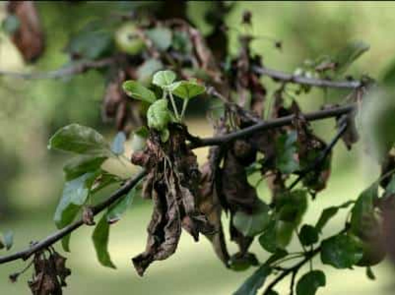 Ձախ նկարում բակտերիալ այրվածքով հիվանդացած տանձենին է, աջում` շարկայից վարակված սալորենու պտուղը»։