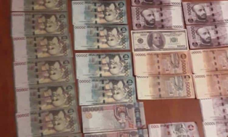 37-ամյա տղամարդու խուզարկությամբ հայտնաբերվեց չորսական 100 և 50 հազարանոց, ութ հատ 10 հազար, 18 հատ 20 հազար դրամանոց և մեկ 100 դոլարանոց հուշանվեր-թղթադրամներ: