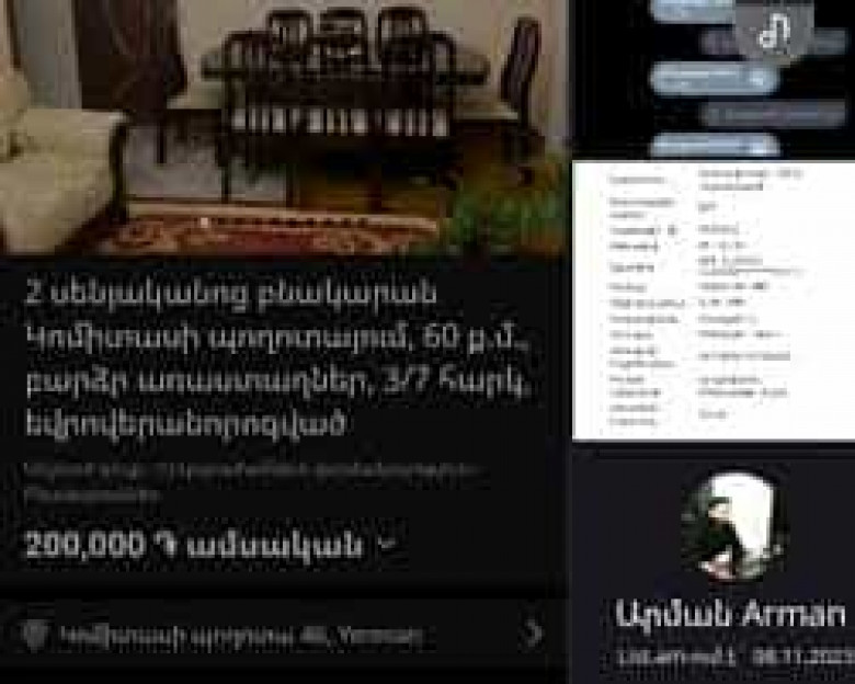 «Երևանում վարձով բնակարան էի փնտրում, երբ համացանցում անշարժ գույքի վարձակալության վերաբերյալ հայտարարություններից մեկում կարդացի Կոմիտասի 48 հասցեում գտնվող բնակարանի վարձակալության մասին, որի ամսավճարը 200 հազար դրամ էր նշված: Միայն լուսանկարներ էին, կոնկրետ շենքի և բնակարանի հասցե նշված չէր, իսկ գործակալի հետ կապվելու համար նշված էին միայն «վայբերի» և «վոցափի» հեռախոսահամարներ: «Վայբերով» զանգահարեցի նշված համարներին, ինձ պատասխանեց Արման անունով անշարժ գույքի գործակալ ներկայացած անձը: Ասացի, որ ցանկանում ենք երկարաժամկետ վարձակալել բնակարանը, և միանգամից պատրաստ ենք երեք ամսվա համար նախավճար փոխանցել: Երկու սենյականոց բնակարանի համար 200.000 դրամ ամսավճար էին պահանջում, համաձայնեց մեր առաջարկին, անգամ ասաց, 180.000 դրամով կտա: