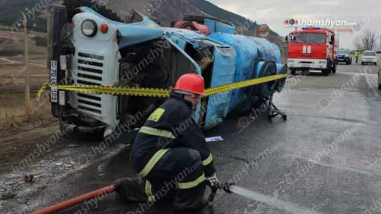 Ինչպես դեպքի վայրից հայտնում է ֆոտոլրագրող Գագիկ Շամշյանը, բախման հետևանքով բենզատարը կողաշրջվել է ու սկսկվել է դիզվառելիքի արտահոսք։