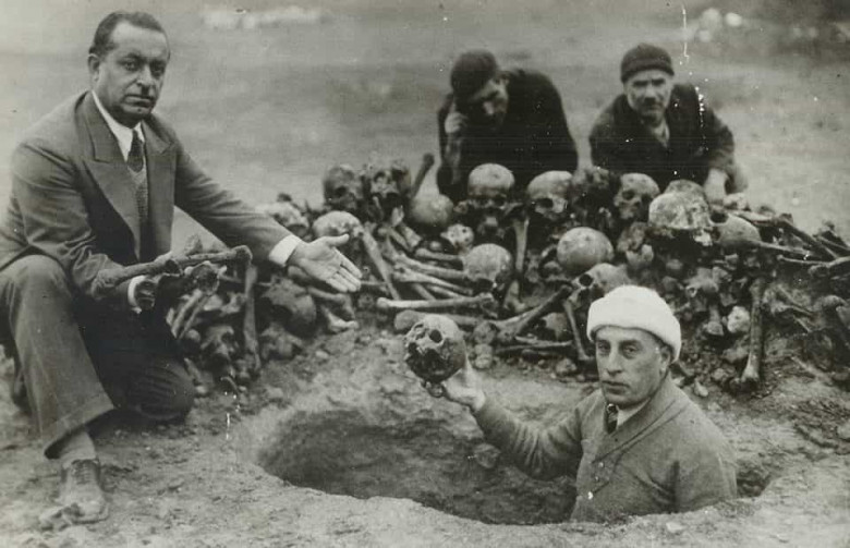 Գերմանացի և թուրք զինվորները հայ զոհերի գանգերը լուսանկարելիս