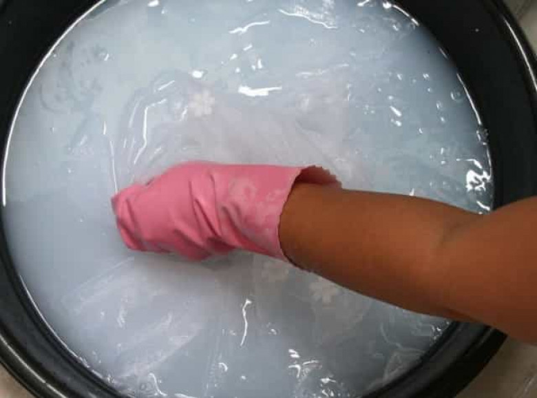 5. Համոզվելով, որ բաժակի հատակին նստվածք չկա, խառնուրդը լցրու աղաջրով ամանի մեջ: Վարագույրը դիր ջրի մեջ, թող 2-3 րոպե՝ անընդհատ շրջելով: