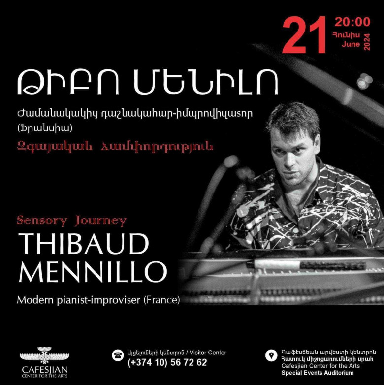 ՄՇԱԿՈՒՅԹՀունիսի 21 Ժամը` 20:00 Գաֆէսճեան արվեստի կենտրոնում տեղի կունենա Փարիզից ժամանաց Թիբո Մենիլոյի «Զգայական ճամփորդություն» Իմպրովիզացիա՝ ոգեշնչված Բախի, Ռավելի, Դեբյուսիի, Կոմիտասի, Գյուրջիևի և Քիթ Ջարեթի ստեղծագործություններով: Ժամանակակից Իմպրովիզատոր/ Դաշնակահար ՝ Թիբո Մենիլոն ոգեշնչված է Ջոն Քոլթրեյնի / ՄակՔոյ Թայների / Քիթ Ջարեթ / Թելոնիուս Մոնք / Չիկ Կորեա / Բիլ Էվանս / Ռենդի Ուեսթոն / Օրնետ Քոլմենի մոտիվներով և ջազ դաշնակահար՝ բոլոր սերունդների ուսուցիչ Ռոջեր Մենիլոյի թոռն է: Իմպրովիզացված դաշնամուրը թույլ է տալիս նրան օգտագործել ոգեշնչման այս բոլոր մեղեդիական, պոլիֆոնիկ և պոլիռիթմիկ աղբյուրները՝ հաճախ արտահայտվելով գործիքի շատ համահունչ կիրառմամբ: Իր ստեղծագործությունների միջոցով Թիբո Մենիլոն մեզ տանում է զգայական ճամփորդության դեպի իր ներքին տիեզերքի սիրտը: