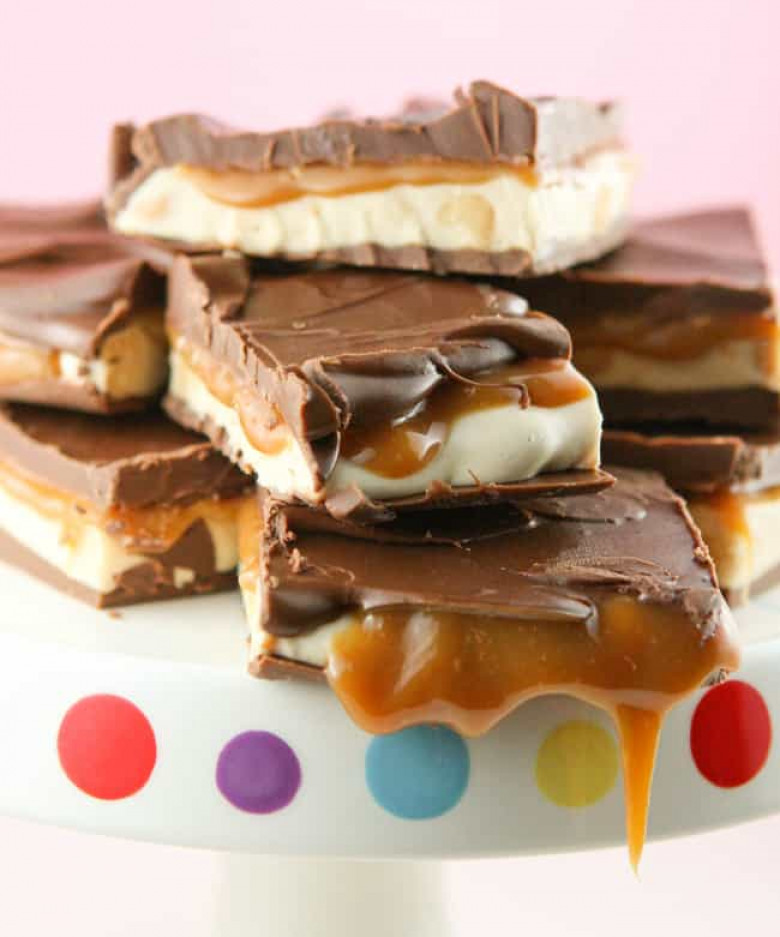 1. Պատրաստում ենք հիմքը: 22 x 23 տրամագծով ձևամանը յուղաթղթպատում ենք: Շոկոլոդների կեսը հալեցնում ենք կամ գոլորշու վրա, կամ միկրոալիքային վառարանում: Լցնում ենք ձամանի մեջ և տարածում, ինչից հետո էլ տեղափոխում ենք սառցախցիկ, որ շոկոլադը շուտ սառչի: