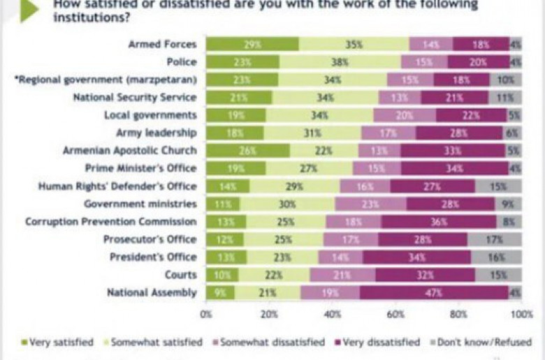Հարցերից մեկը վերաբերում է նրան, թե, որ կառույցի աշխատանքից են գոհ քաղաքացիները: Հարցման արդյունքում պարզվել է, որ ամենաշատը գոհ են Զինված ուժերից (Պաշտպանության նախարարությունից), իսկ դժգոհ՝ խորհրդարանի աշխատանքներից։