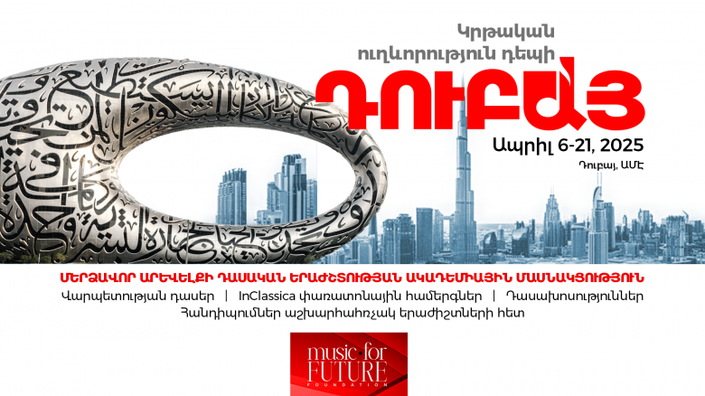 Մերձավոր Արևելքի դասական երաժշտության ակադեմիան «Երաժշտություն հանուն ապագայի» հիմնադրամի հետ միասին առաջարկում են ճանապարհորդության բացառիկ հնարավորություն: Հիմնադրամն արդեն երրորդ անգամ նախաձեռնում է «Կրթական ուղևորություն» դեպի Դուբայ: Ակադեմիան անցկացվելու է 2025 թ․-ի ապրիլի 6-ից 21-ը։