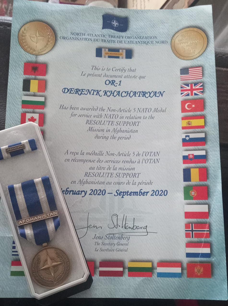 Դերենիկն իր զինվորական ծառայությունը շարունակում է ՀՀ ՊՆ Խաղաղապահ զորքերի կազմում: Իր առաջադիմության և նվիրված աշխատանքի շնորհիվ ընդունվելուց երկու ամիս անց մեկնել է Ռուսաստան և Գերմանիա՝ վերապատրաստումների։ Գերմանիայից վերադարձել է վկայականով: Մեծ ցանկություն ուներ Աֆղանստան մեկնելու, իսկ այնտեղից վերադառնալուց հետո տուն կառուցելու և ընտանիք կազմելու մասին էր երազում: Իր կարգապահ և նվիրված ծառայության արդյունքում նա խաղաղապահ առաքելության շրջանակում մեկնում է Աֆղանստան: Այնտեղ մնում է ինն ամիս: 2020 թ. սեպտեմբերի 20-ին վերադառնում է հայրենիք: Աֆղանստանում խաղաղապահ առաքելության ավարտին պարգևատրվել է ՆԱՏՕ-ի մեդալով՝ «Վճռական աջակցություն» առաքելությանը մասնակցելու համար: