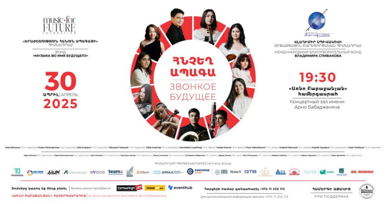 ՄՇԱԿՈՒՅԹԱպրիլի 30-ին՝ ժամը 19։30-ին, «Առնո Բաբաջանյան» համերգասրահում տեղի կունենա «Հնչեղ ապագա» խորագրով համերգը՝ «Երաժշտություն հանուն ապագայի» հիմնադրամի և Վլադիմիր Սպիվակովի միջազգային բարեգործական հիմնադրամի կրթաթոշակառուների մասնակցությամբ: Համերգը կազմակերպվում է «Մոսկվայի տուն» մշակութային գործարար կենտրոնի աջակցությամբ։ Իսկ տոմսերի վաճառքից ստացված ողջ հասույթը կուղղվի «Երաժշտություն հանուն ապագայի» հիմնադրամի տաղանդավոր երաժիշտների համար իրականացվող կրթական ծրագրերին: Այս համերգը ևս մեկ կարևոր քայլ է մասնագիտական բարձունքների ձգտող երիտասարդ երաժիշտների ստեղծագործական զարգացման և մշակութային փոխանակման ուղղությամբ։