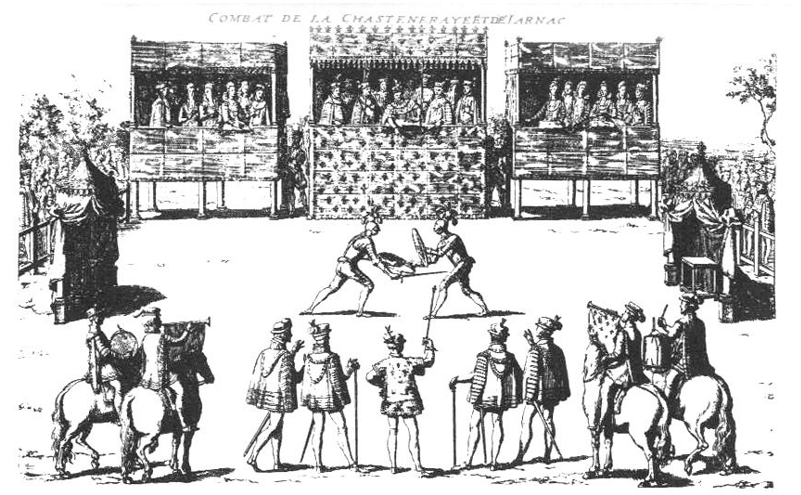 Հիմա մի փոքր պատմություն: Գի դե Շաբո սինյոր Ժարնակը (1514-1584) ֆրանսիացի պալատական, զինվոր և նահանգապետ էր։ Ֆրանցիսկոս 1-ին թագավորի արքունիքում նրա անունը սկանդալի մեջ էր հայտնվել, նրան մեղադրել էին սեփական խորթ մոր հետ սիրային կապ ունենալու մեջ։ Իր համբավը վերականգնելու համար էլ Ժարնակը մարտահրավեր էր նետել այդ լուրերը տարածող մարդուն՝ սինյոր դը Լա Շատայնին, ով համարվում էր Ֆրանսիայի լավագույն սուսերամարտիկներից մեկը։ Ժարնակը, իր հերթին, առանձնապես հմուտ չէր սուսերամարտում։ 1547 թվականի հուլիսի 10-ին տեղի է ունեցել այդ հայտնի մենամարտը։ Մինչ դուելը սկսվելը, երկու մարտիկներն էլ Ավետարանի վրա երդվել են, որ կռվում են հանուն ճշմարտության, և որ նրանցից ոչ մեկը չի դիմել կախարդության։ Նրանք երկար ժամանակ փոխանակվել են հարվածներով, սակայն ապարդյուն, ապա Ժարնակը շեղող շարժում է կատարում ստիպելով մրցակցին ձեռքերը բարձրացնել, իսկ հետո արագ հարվածում է նրա ծնկին։ Թեև վերքն ինքնին լուրջ չէր, բայց Լա Շատենյեն կորցրել է հավասարակշռությունն ու ընկել: Ժարնակն անմիջապես պահանջել է, որ նա ընդունի պարտությունը և ներողություն խնդրի, սակայն հանդիսատեսը ցնցված է եղել անսպասելի արդյունքից։ Ինքը՝ Լա Շատենյեն, հրաժարվել է ընդունել պարտությունը փորձելով վեր կենալ և շարունակել պայքարը։ Իհարկե, Ժարնակը կարող էր վերջ տալ իր հակառակորդին, բայց փոխարենը զինաթափել է նրան։ Արդյունքում արքան է միջամտել և դադարեցրել մենամարտը։