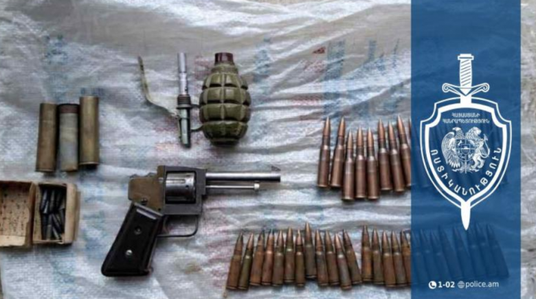 Համայնքային ոստիկանները նշված վայրում հայտնաբերել են 4,5 մմ տրամաչափի թմբուկավոր ատրճանակ՝ 10 փամփուշտով, «Ֆ1» տիպի նռնակ՝ պայթուցիչով, տարբեր տրամաչափի և տարբեր հրազենների 43 փամփուշտ: