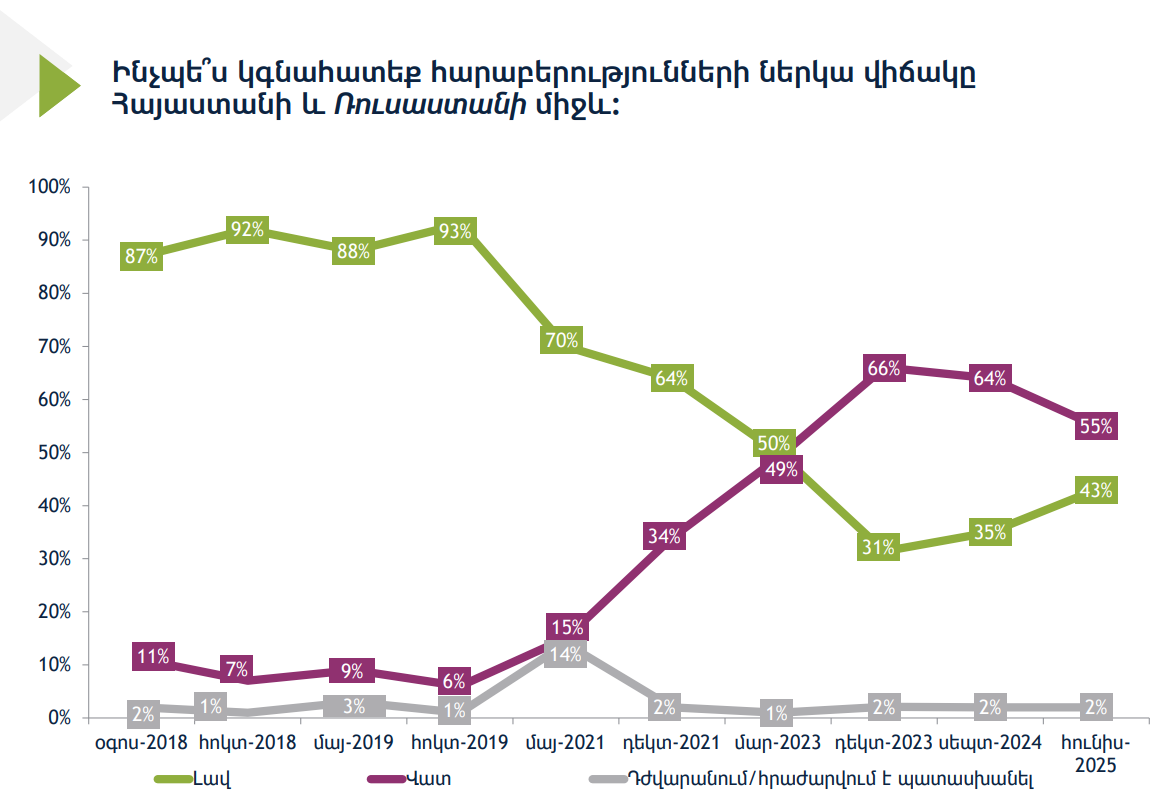 Ամերիկյան միջազգային հանրապետական ինստիտուտի վերջին հարցումները չափազանց ուշագրավ մի տենդենց են արձանագրում։ Մասնավորապես, հարցերից մեկը վերաբերում էր Հայաստանի և Ռուսաստանի միջև հարաբերությունների ներկայիս վիճակին։ 2025 թվականի հունիսին հարցվածների 55 տոկոսը վատ է գնահատել հարաբերությունների ներկայիս վիճակը, դրական՝ միայն 43 տոկոսը։ Առաջին հայացքից այս զարգացումը կարող է տարօրինակ թվալ, բայց հաշվի առնելով նախորդ հարցումների հետ, չէ՛,  բավականին ուշագրավ պատկեր ենք ստանում։