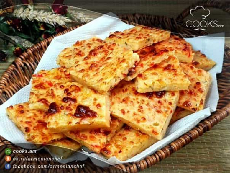 Կաթնաշոռը փշրում ենք, վրան լցնում ենք 100 գր մանրացրած պանիրն ու 100 գր Չեդդեր պանիրը, ավելացնում ենք ձվերը և հարում: Բլենդերում հարում ենք տաքդեղն ու վարունգը և լցնում նախորդ զանգվածի մեջ: Ավելացնում ենք մաղած ալյուրը, աղը, պղպեղը, սոդան, կիտրոնի աղը և հազրեվարդը: Այնուհետև ավելացնում ենք մարինադի ջուրն ու խմոր հունցում: