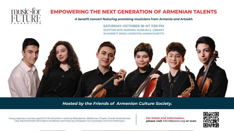 ՄՇԱԿՈՒՅԹ«Երաժշտություն հանուն ապագայի» հիմնադրամը հոկտեմբերի 18-ին առաջին անգամ կներկայանա ԱՄՆ-ում՝ Բոստոնի Scottish Rite Museum and Library-ի համերգասրահում, որտեղ համերգային ելույթներով հանդես կգան Հիմնադրամի կրթաթոշակառուները։ Համերգը կազմակերպվում է Friends of Armenian Culture Society (FACS)-ի հետ համագործակցությամբ և հանդիսանալու է մեծ մշակութային իրադարձություն՝ ներկայացնելով Հայաստանի վառ երիտասարդ երաժիշտներին և միավորելով սփյուռքի հայ համայնքին՝ աջակցելու հայ տաղանդավոր երեխաների հաջողությանը և ապագայի կերտմանը: