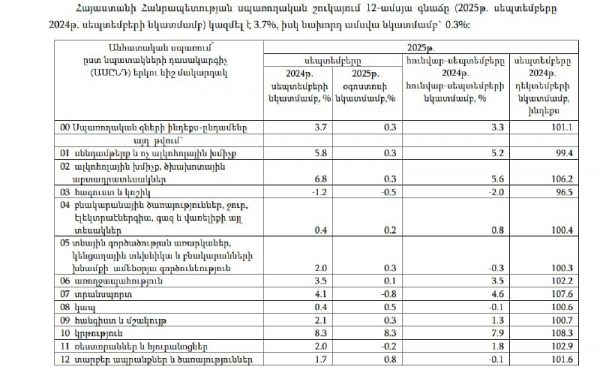 ՏՆՏԵՍՈՒԹՅՈՒՆՀայաստանի Հանրապետության սպառողական շուկայում 12-ամսյա գնաճը կազմել է 3.7%, իսկ նախորդ ամսվա նկատմամբ` 0.3%: