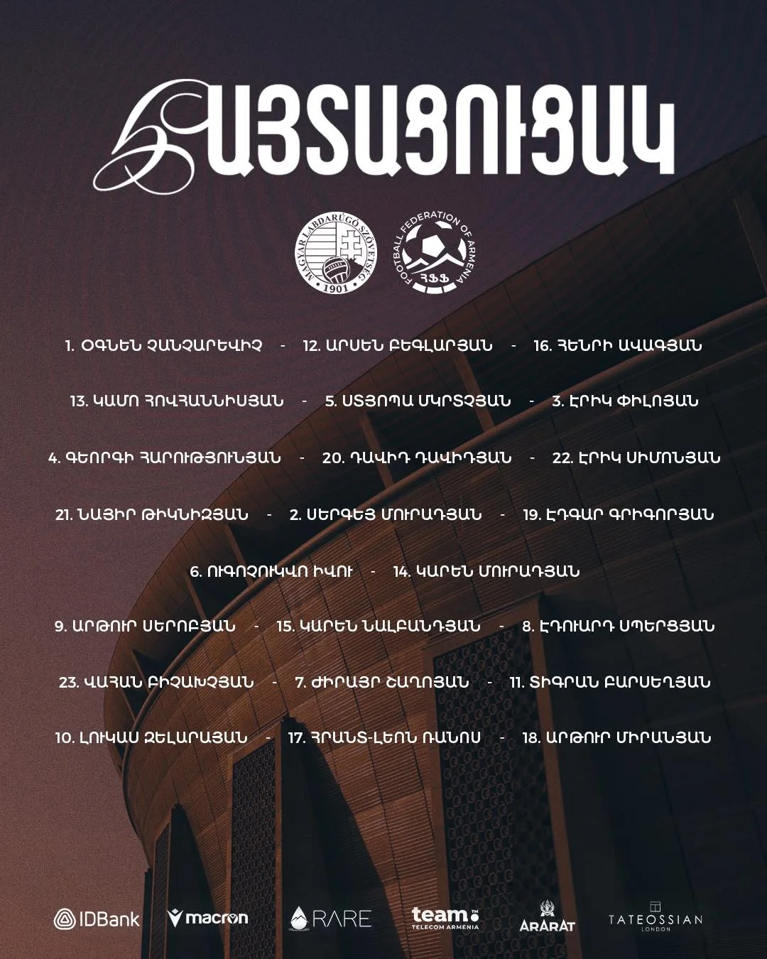 ՀՖՖ-ից ներկայացրել են Հայաստանի ազգային հավաքականի վերջնական հայտացուցակը Հունգարիայի դեմ խաղում։