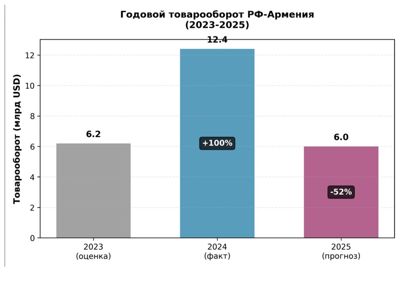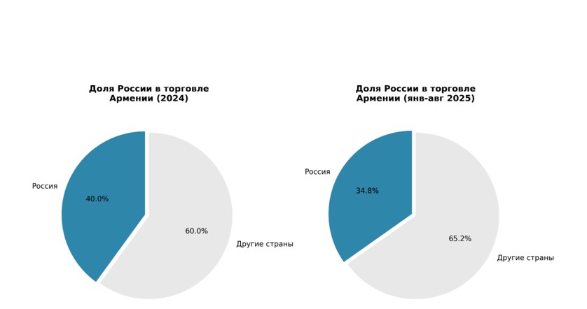 Наши исследования показывают, что по итогам 2025 года армяно–российский товарооборот достигнет не менее 7 миллиардов долларов, что является значительным снижением по сравнению с предыдущим годом. Тем не менее, Россия остается главным торговым партнером Армении, на долю которого приходится 34,8% всей внешней торговли нашей страны. Дальнейшая динамика, по мнению экспертов, будет зависеть от ряда факторов, включая региональные геополитические развития, предстоящие парламентские выборы и дальнейшие шаги внешней экономической политики Армении.