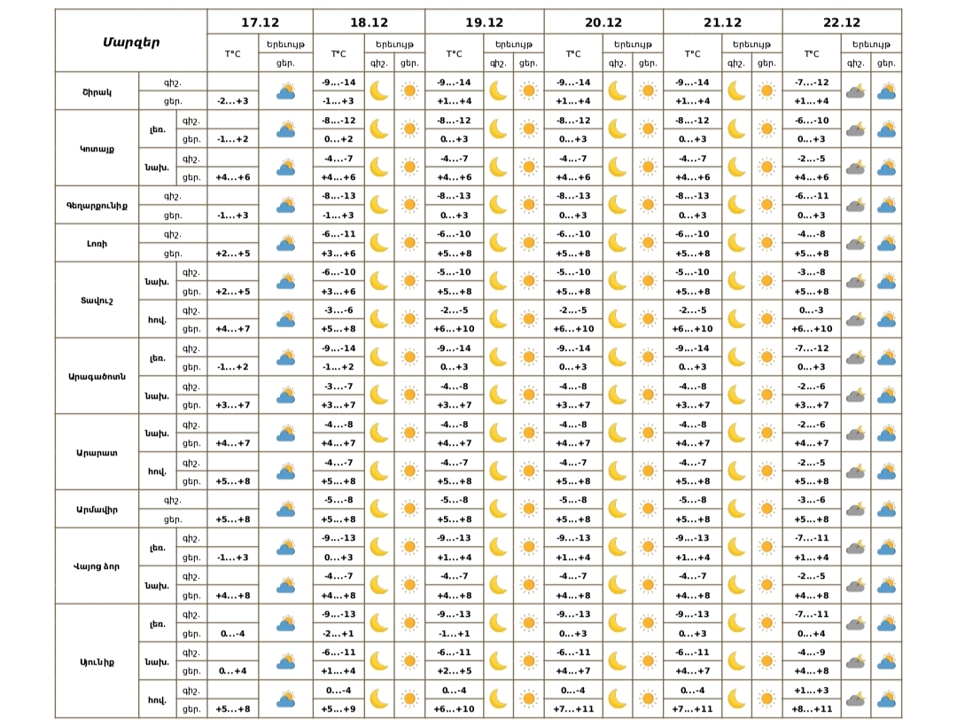 Դեկտեմբերի 17-ի ցերեկը, 18-22-ին սպասվում է առանց տեղումների եղանակ։ Դեկտեմբերի 19-22-ին Արարատյան դաշտի ցածրադիր հատվածներում առավոտյան ժամերին սպասվում է մառախուղ։ Քամին հյուսիսային՝ 2-5մ/վ։ Օդի ջերմաստիճանն էապես չի փոխվի։