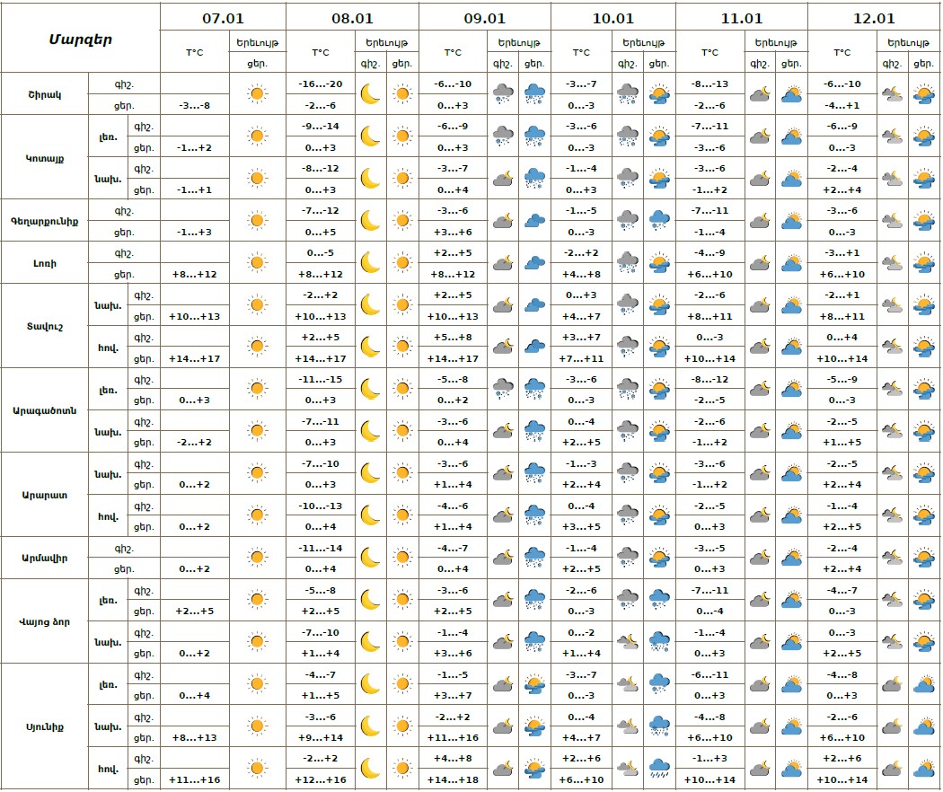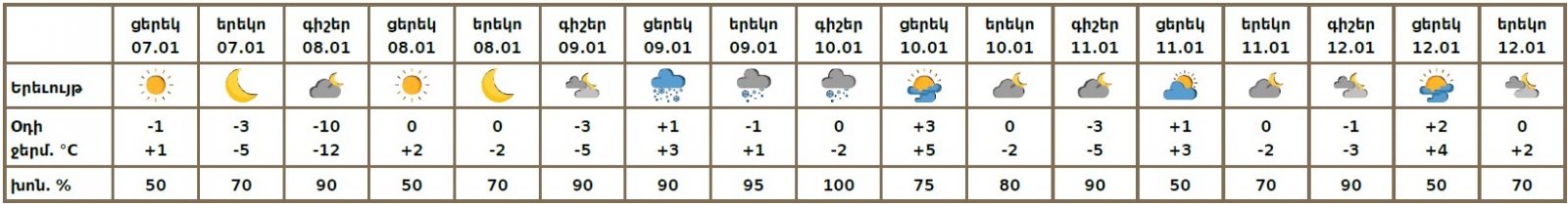 Հունվարի 7-ի ցերեկը, hունվարի 8-ին, 9-ի գիշերը, 10-ի ցերեկը, 11-12-ին սպասվում է առանց տեղումների եղանակ: Հունվարի 9-ի ցերեկը, 10-ի գիշերը և առավոտյան սպասվում է ձյուն: