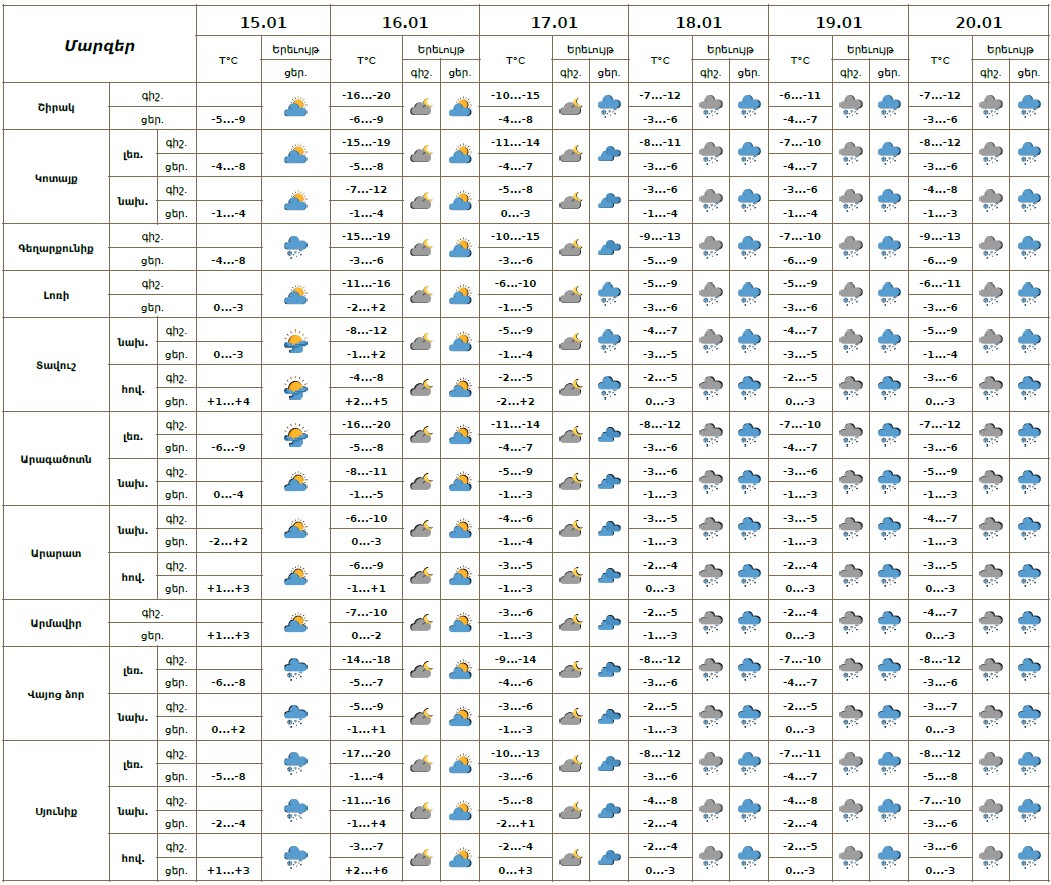 Հունվարի 15-ի և 17-ի ցերեկն առանձին շրջաններում, 17-ի ուշ երեկոյան, 18-20-ին շրջանների մեծ մասում սպասվում է ձյուն, լեռնային առանձին վայրերում՝ բուք, ցածր հորիզոնական տեսանելիություն։ Հունվարի 16-ին, 17-ի գիշերը սպասվում է առանց տեղումների եղանակ։ Քամին հյուսիսարևմտյան 2-5մ/վ։ Օդի ջերմաստիճանը հունվարի 15-ի ցերեկը, 16-ին կնվազի ևս 4-6 աստիճանով, հունվարի 17-19-ին գիշերային ժամերին աստիճանաբար կբարձրանա 7-10 աստիճանով։