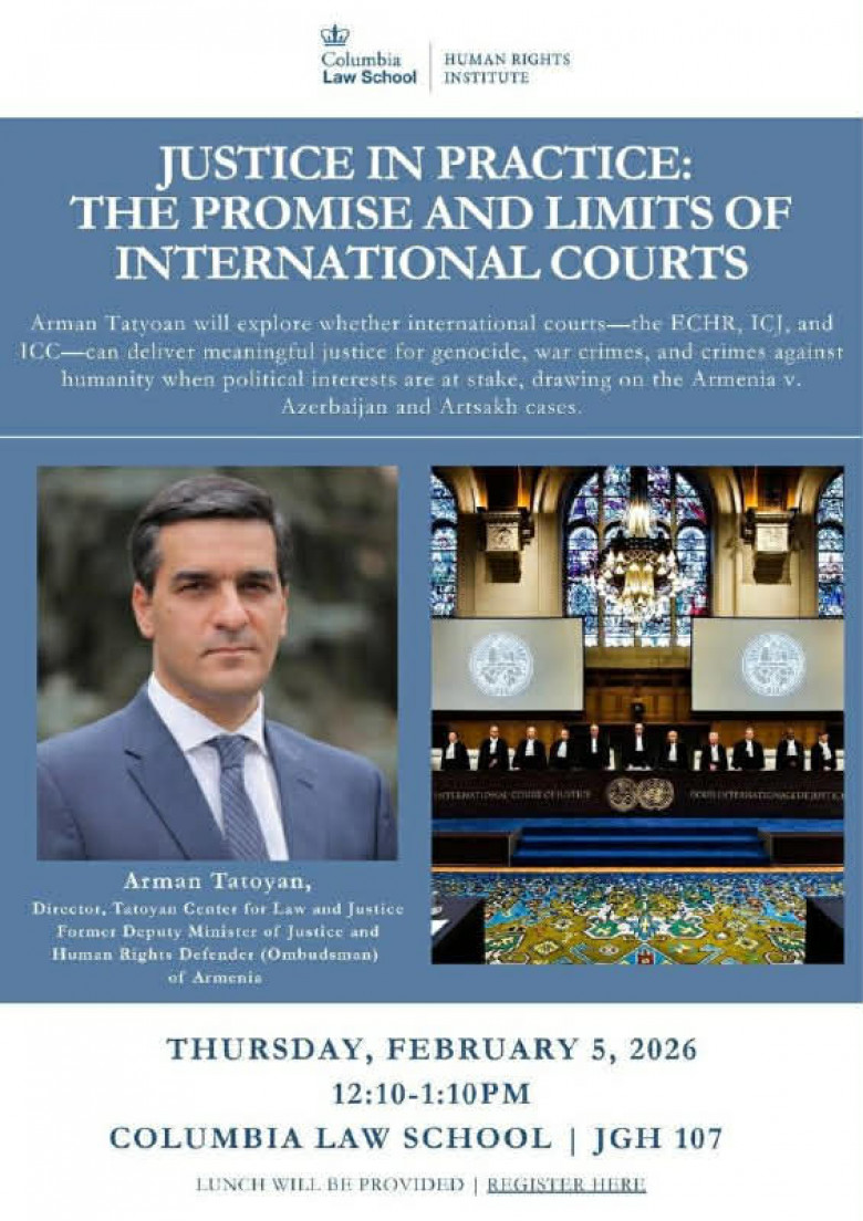 Հավելենք, որ Արման Թաթոյանը դասախոսությամբ հանդես կգա ԱՄՆ-ի Կոլումբիայի համալսարանում «Արդարադատությունը գործնականում. հեռանկարները և սահմանները միջազգային դատարաններում» թեմայով։ Իր ելույթում Արման Թաթոյանը կանդրադառնա միջազգային դատական մարմինների, մասնավորապես՝ Մարդու իրավունքների եվրոպական դատարանի, Արդարադատության միջազգային դատարանի և Միջազգային քրեական դատարանի դերին՝ մարդու իրավունքների խախտումներին արձագանքելու գործում: Նա կքննարկի, թե որքանով է արդարադատությունը հասանելի այն դեպքերում, երբ գործերը առնչվում են պետությունների քաղաքական շահերին, կներկայացնի դատավճիռների կատարման մեխանիզմները և կվերլուծի յուրաքանչյուր դատարանի կոնկրետ լիազորությունները։ Քննարկման առանցքում կլինեն մարդու իրավունքների ծանր խախտումները՝ ներառյալ ցեղասպանությունը, պատերազմական հանցագործությունները և մարդկության դեմ ուղղված հանցագործությունները։ Արման Թաթոյանը կներկայացնի նաև «Հայաստանն ընդդեմ Ադրբեջանի» և «Արցախ» գործերը։