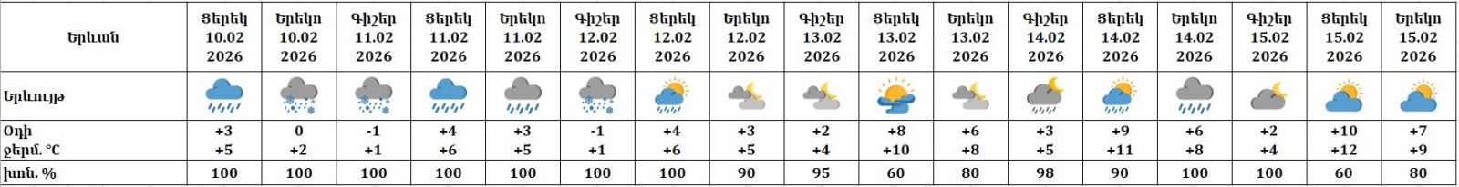 Միջերկրական ծովից ցիկլոնի ներթափանցմամբ պայմանավորված փետրվարի 10-ին ցերեկը, փետրվարի 11-ի գիշերը շրջանների մեծ մասում, փետրվարի 11-ի ցերեկը առանձին շրջաններում սպասվում են տեղումներ, փետրվարի 10-ի ցերեկը նախալեռնային և հովտային գոտում ձնախառն անձրևի և անձրևի, փետրվարի 10-ի լույս 11-ի գիշերը ողջ հանրապետությունում՝ ձյան և ձնախառն անձրևի տեսքով։ Փետրվարի 10-ի ցերեկը և 11-ի գիշերը տեղումներն առանձին վայրերում կլինեն զգալի։ Լեռնային առանձին գոտիներում սպասվում է քամու ուժգնացում 15-18մ/վրկ, բուք, ցածր հորիզոնական տեսանելիություն։ Փետրվարի 10-11-ին հանրապետության առանձին շրջաններում սպասվում է նաև մառախուղ։ Փետրվարի 11-ի առավոտյան ժամերին առանձին ավտոճանապարհների սպասվում է նաև մերկասառույց։
