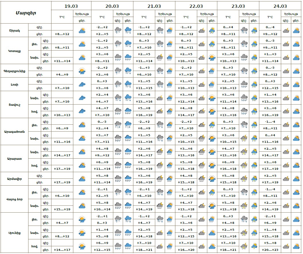 Մարտի 19-ի ցերեկը, 24-ին սպասվում է առանց տեղումների եղանակ։ Մարտի 20-ին ժամանակ առ ժամանակ`շրջանների մեծ մասում, 21-23-ին առանձին շրջաններում սպասվում են տեղումներ. լեռնային գոտիներում՝ թաց ձյան, նախալեռնային և հովտային գոտիներում՝ անձրևի տեսքով։ Առանձին վայրերում հնարավոր է ամպրոպ։ Քամին`հյուսիսարևմտյան` 2-5 մ/վ։ Օդի ջերմաստիճանն էապես չի փոխվի։
