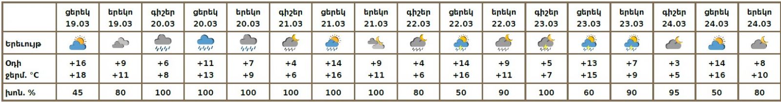 Մարտի 19-ի ցերեկը, 24-ին սպասվում է առանց տեղումների եղանակ։ Մարտի 20-ին ժամանակ առ ժամանակ սպասվում է անձրև։ Մարտի 21-23-ին սպասվում է կարճատև անձրև, հնարավոր է նաև ամպրոպ։