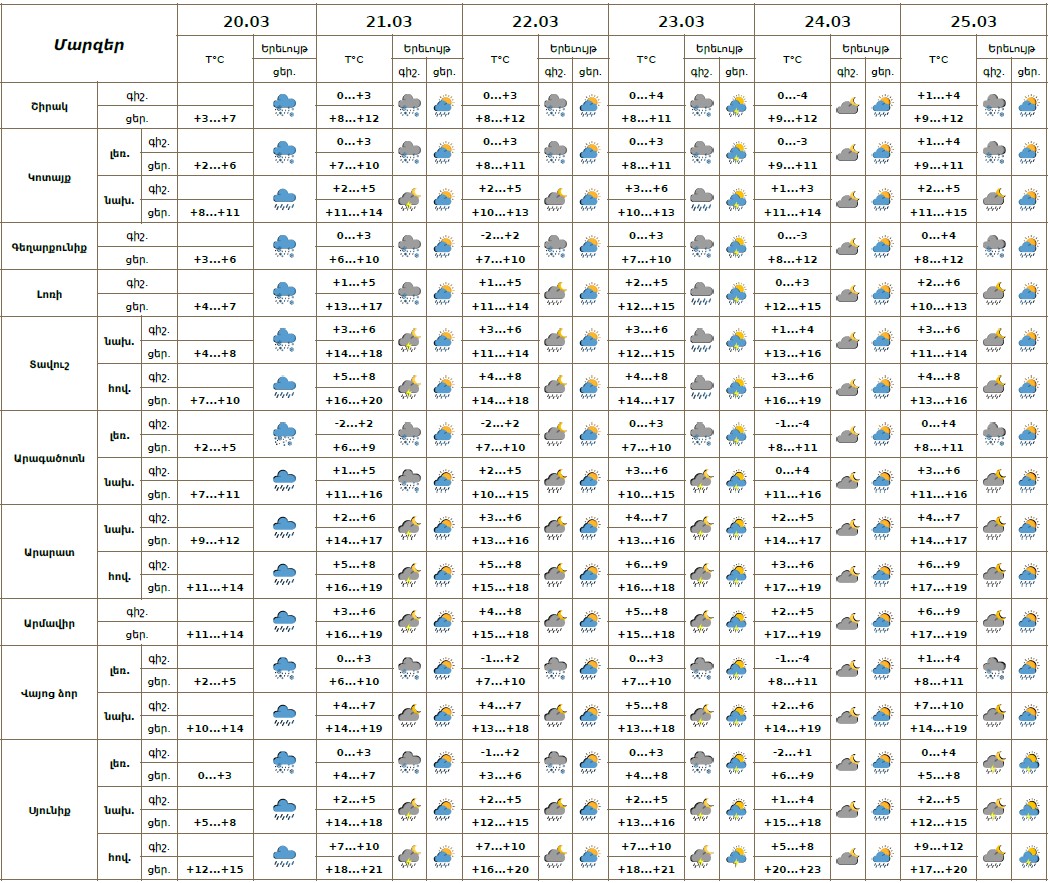 Մարտի 20-ի ցերեկը ժամանակ առ ժամանակ`հանրապետության ողջ տարածքում, 21-25-ին շրջանների մեծ մասում սպասվում են տեղումներ. լեռնային գոտիներում՝ թաց ձյան, նախալեռնային և հովտային գոտիներում՝ անձրևի տեսքով։ Առանձին վայրերում հնարավոր է ամպրոպ։