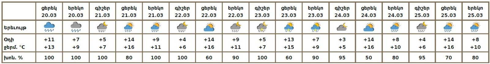 Մարտի 20-ի ցերեկը ժամանակ առ ժամանակ սպասվում է անձրև։ Մարտի 21-25-ին սպասվում է կարճատև անձրև, հնարավոր է նաև ամպրոպ։