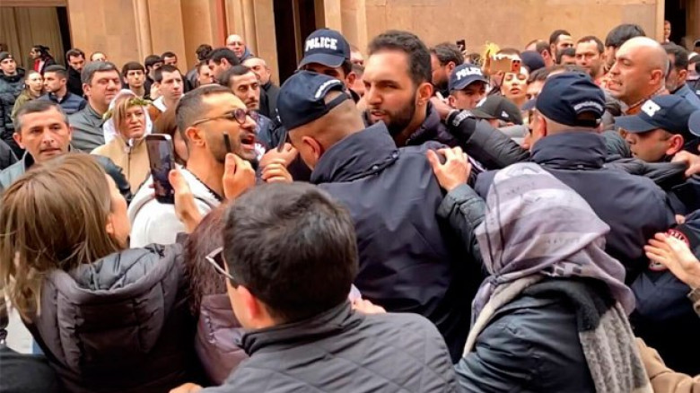 Մոտ մեկ ժամ անց եկեղեցու բակից ոստիկանները բիրտ ուժով բերման ենթարկեցին Դավիթ և Միքայել Մինասյան եղբայրներին, ինչպես նաև Հայ ազգային ճակատի հիմնադիր, քաղաքական գործիչ Գևորգ Գևորգյանին։