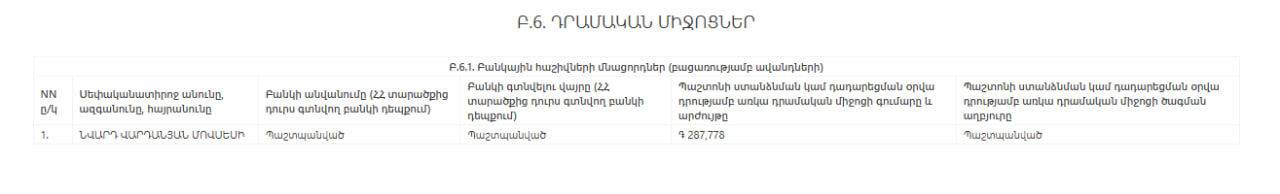 Բանկային հաշիվների մնացորդները կազմել են 287,778 դրամ։ Էլեկտրոնային հաշիվներում և կրիպտոարժույթով առկա միջոցները կազմել են 1,159,998.8 դրամ։ Կանխիկ միջոցները կազմել են 3,570 եվրո, 6,760 ԱՄՆ դոլար և 750,000 դրամ։