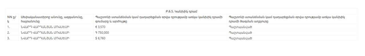 Վարկային պարտավորությունը պաշտոնը դադարեցնելու օրվա դրությամբ կազմել է 10,318,010 դրամ՝ անշարժ գույքի ձեռքբերման վարկ։