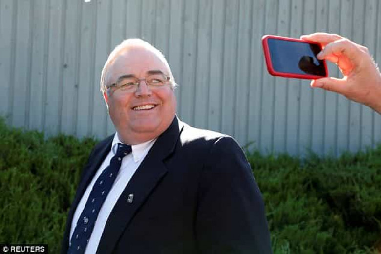 Blackmore, who is accused of having two dozen wives, smiles at a reporter's phone as he arrives at the BC Supreme Court Monday