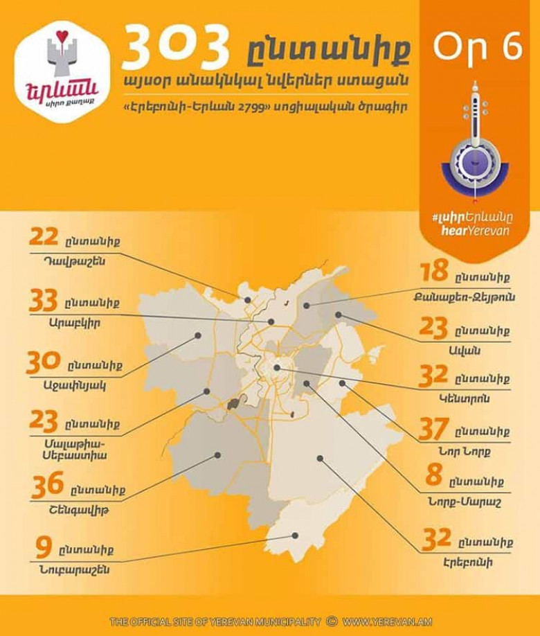 ՀԱՍԱՐԱԿՈՒԹՅՈՒՆԱրդեն վեց օր անընդմեջ շարունակվում է «Էրեբունի-Երևան 2799» միջոցառումների ծրագրով «Երևան՝ սիրո քաղաք» կարգախոսի ներքո իրականացվող սոցիալական ծրագիրը: Երևանի քաղաքապետարանի և վարչական շրջանների աշխատակիցներից բաղկացած խմբերը շրջել են Երևանի տարբեր շրջաններում, այցելել թվով 303 ընտանիք ու փոխանցել Երևանի քաղաքապետի շնորհավորանքն ու անակնկալ նվերները: