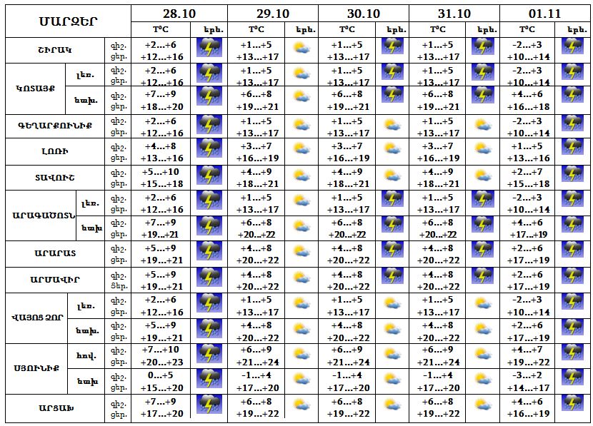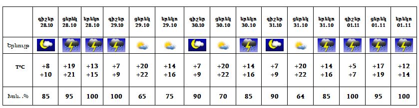 Հանրապետության տարածքում հոկտեմբերի 28-ին` օրվա երկրորդ կեսին, 29-ի գիշերը, նոյեմբերի 1-ին շրջանների զգալի մասում, 30-31-ը արևմտյան շրջաններում սպասվում է անձրև և ամպրոպ, առանձին շրջաններում՝ քամու ուժգնացում՝ 15-20մ/վ արագությամբ: 29-ի ցերեկը սպասվում է առավելապես առանց տեղումների եղանակ: