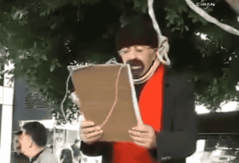 Հրապարակված տեսանյութում երևում է, որ ելույթ ունեցող տղամարդը ինչ-որ տեքստ է ընթերցում ձեռքում պահած, իսկ նրա պարանոցին գցած պարանը կապված է քաղաքի հրապարակում աճող ծառից: