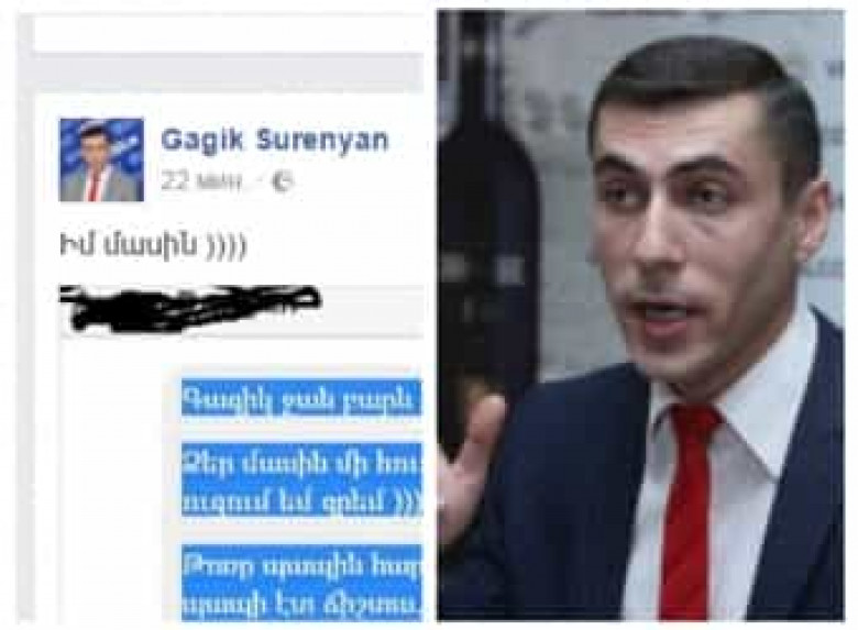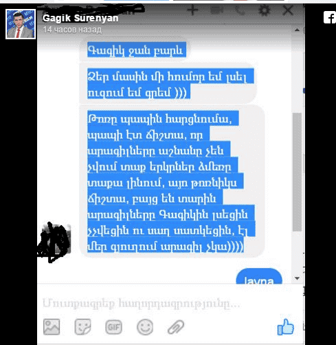 Գագիկ Սուրենյանը իրեն չատով ուղղարկած` իր մասին հումորը տեղադրել է իր էջին ԱՄԵՆԱԸՆԹԵՐՑՎԱԾ 14 Օգոստոս, 2016 18:35 Կիսվել Նյոութի աղբյուրն՝ այստեղ Կիսվել