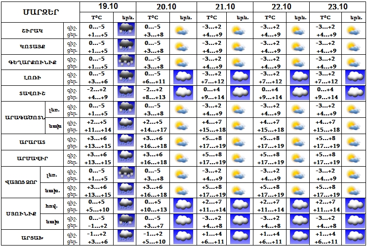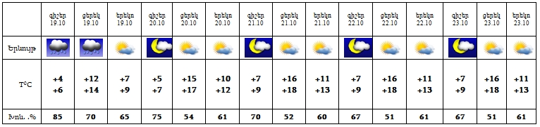 Հոկտեմբերի 19-ին շրջանների մեծ մասում սպասվում են տեղումներ, լեռնային գոտիներում, Լոռու, Տավուշի, Սյունիքի և Արցախի նախալեռնային հատվածներում‵ ձյուն: 20-23-ը սպասվում է առանց տեղումների եղանակ: