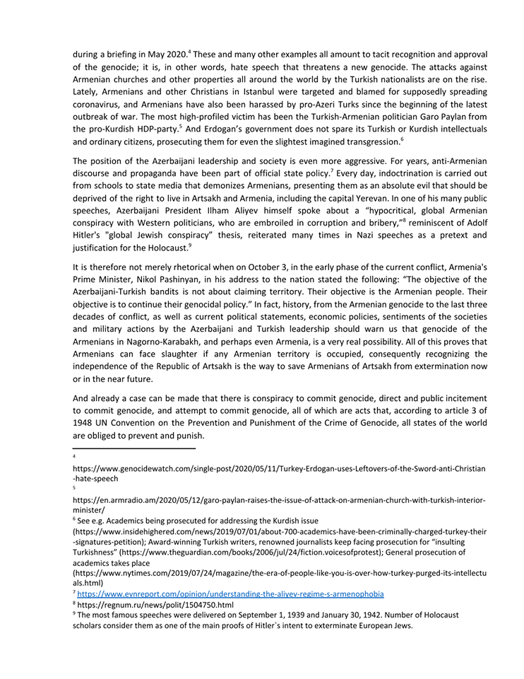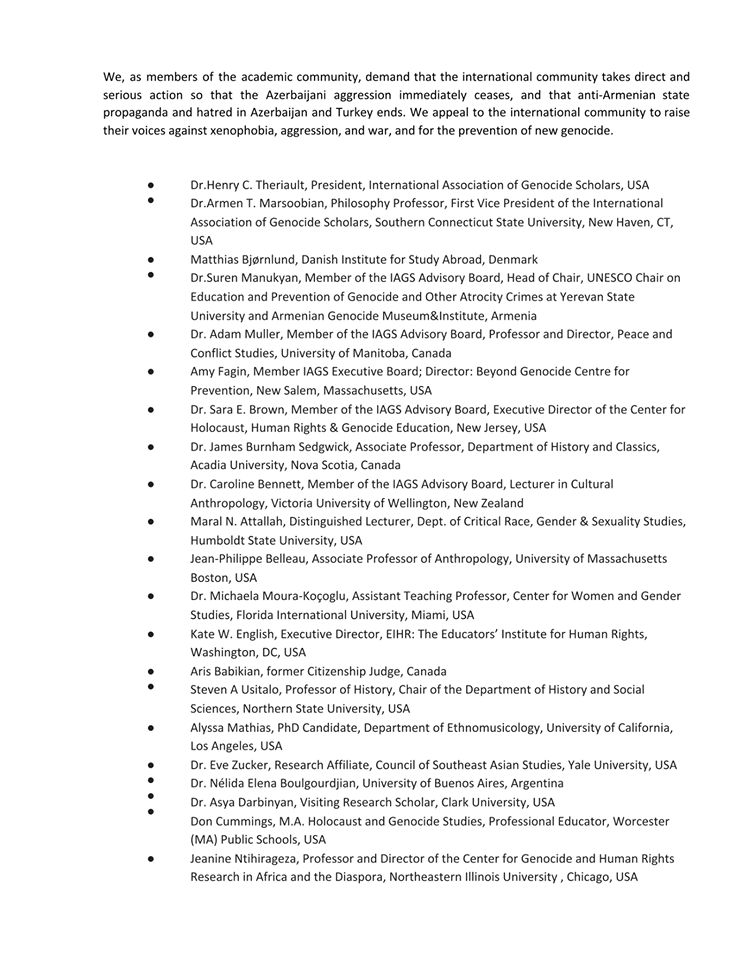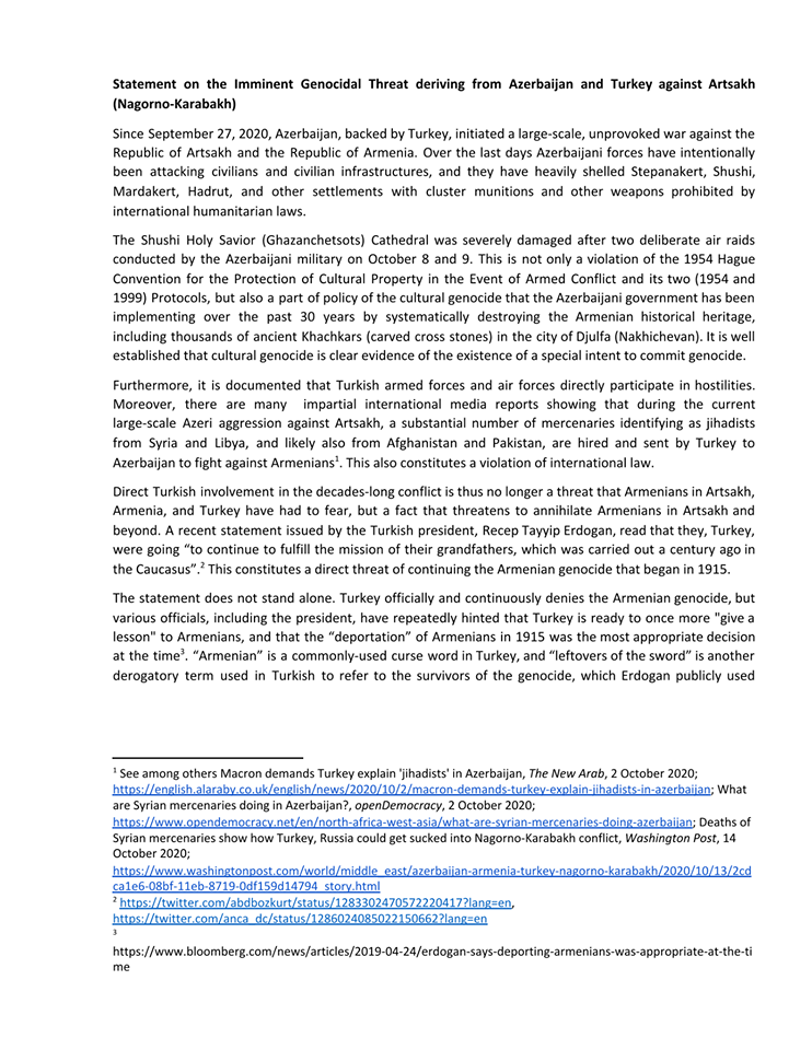 Ցեղասպանագետների միջազգային միությունը հանդես է եկել հայտարարությամբ՝ նշելով, որ Ադրբեջանի ու Թուրքիայի գործողություններում Արցախի հայության նկատմամբ ցեղասպանության վտանգ կա: