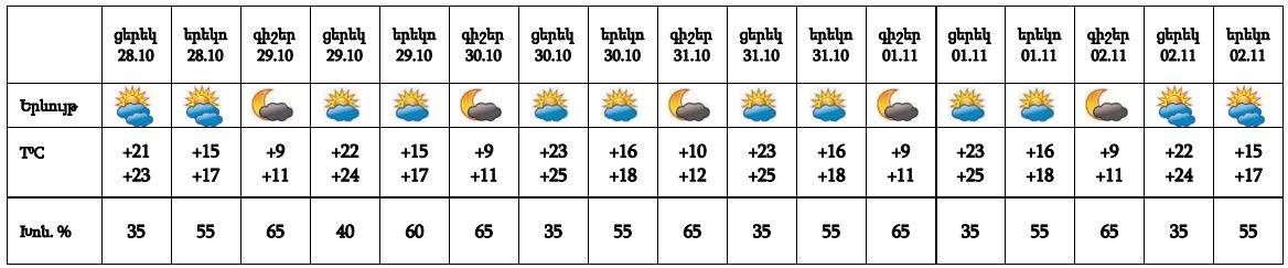 Օդի ջերմաստիճանը հոկտեմբերի 28-ի ցերեկը կնվազի 2-4 աստիճանով, 29-30-ին աստիճանաբար նույնքան կբարձրանա։