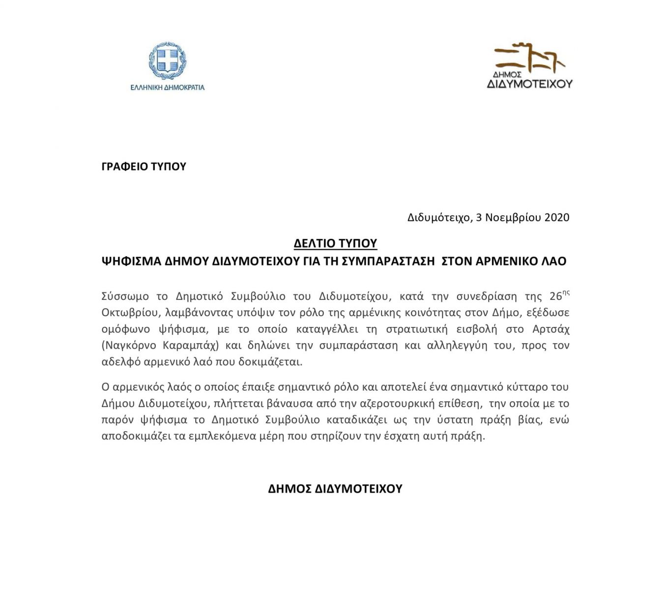Հունական Դիդիմոտիխոն քաղաքի քաղաքային խորհուրդը բանաձև է ընդունել՝ դատապարտելով Արցախի դեմ ադրբեջանա-թուրքական հարձակումները