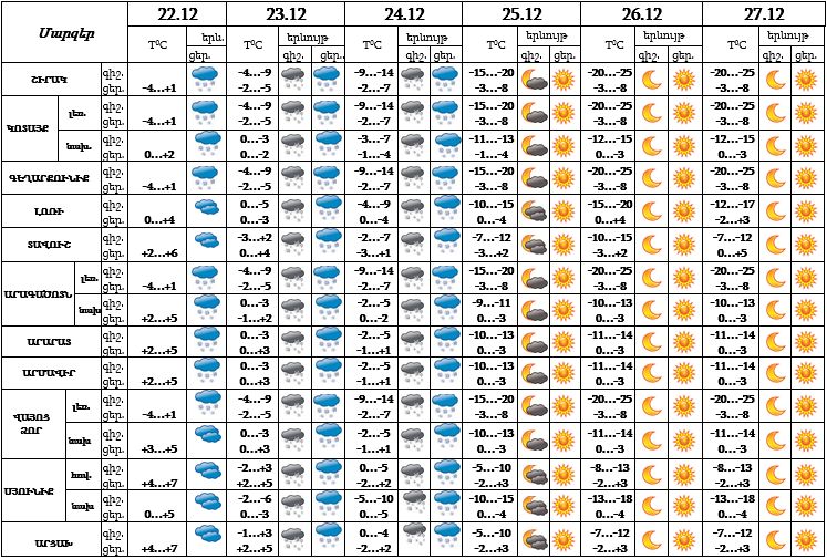 Դեկտեմբերի 22-ի ցերեկն առանձին շրջաններում, 23-24-ը շրջանների զգալի մասում սպասվում է ձյուն, առանձին հատվածներում՝ ինտենսիվ, լեռնային շրջաններում և լեռնանցքներում՝ բուք, ճանապարհներին՝ մերկասառույց: Դեկտեմբերի 25-27-ը սպասվում է առանց տեղումների եղանակ։ Քամին՝ հյուսիս-արևելյան՝ 5-10 մ/վ: Օդի ջերմաստիճանը 25-26-ի գիշերն աստիճանաբար կնվազի  8-10 աստիճանով: