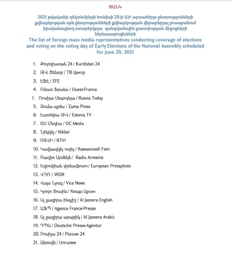 Կենտրոնական ընտրական հանձնաժողովը հունիսի 20-ին կայանալիք արտահերթ խորհրդարանական ընտրությունների լուսաբանման համար հավատարմագրել է 49 օտարերկրյա լրատվամիջոցների։