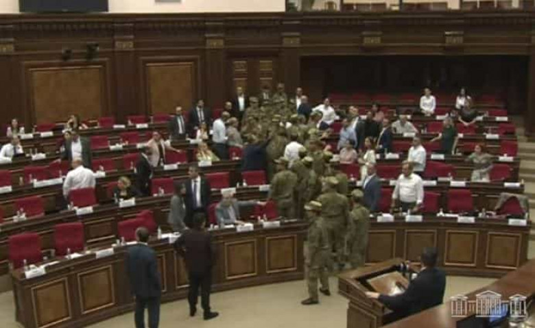 «Լռությու՛ն դահլիճում, երբ որ ասում եմ լռություն դահլիճում, կրքե՞ր են բորբոքվում։ Նախազգուշացում տիկին Խամոյանին և պարոն Ռուստամյանին», - ասաց Սիմոնյանը։ Իրավիճակը լարվեց, սկսվեց հրմշտոց Ալեն Սիմոնյանը դահլիճ հրավիրեց անվտանգության աշխատողներին, կարգադրեց անջատել ուղիղ եթերը: «Ես ներս եմ հրավիրում անվտանգության աշխատողներին, խնդրում եմ կարգուկանոն հաստատել դահլիճում, խնդրում եմ եթերն անջատել»։ Միջամտության համար նիստերի դահլիճ եկան անվտանգության աշխատակիցները։ ԱԺ նիստերի հեռարձակումը դադարեցվեց։