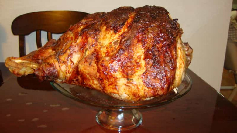 Համեմել մանանեխով, աղով ու համեմունքներով, տեղափոխել տապակի մեջ, կողքերը դափնու տերևներ շարել, ապա ծածկել փայլաթիթեղով։ Տապակի մեջ ջուր լցնել և 220° С ջեռոցում եփել 4 ժամ։